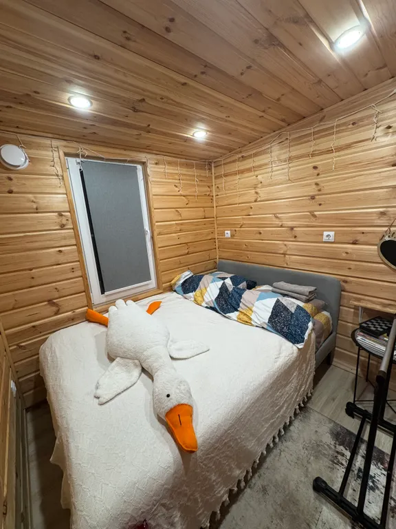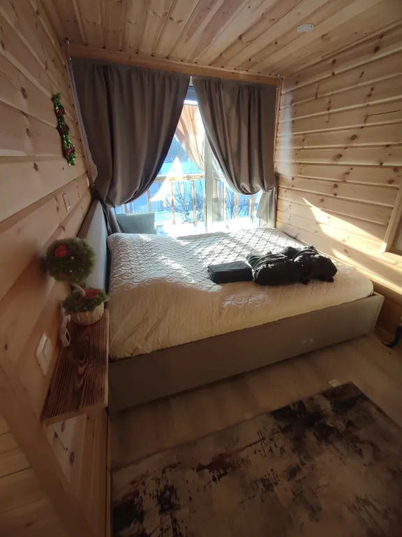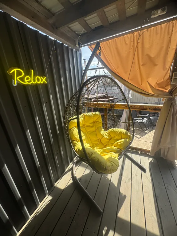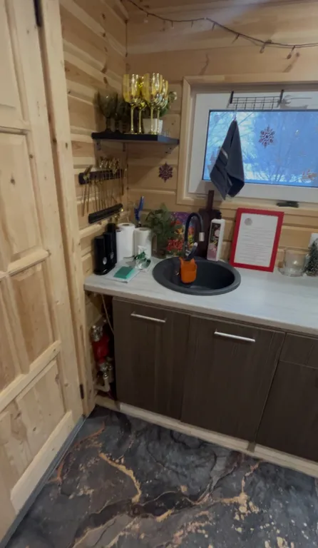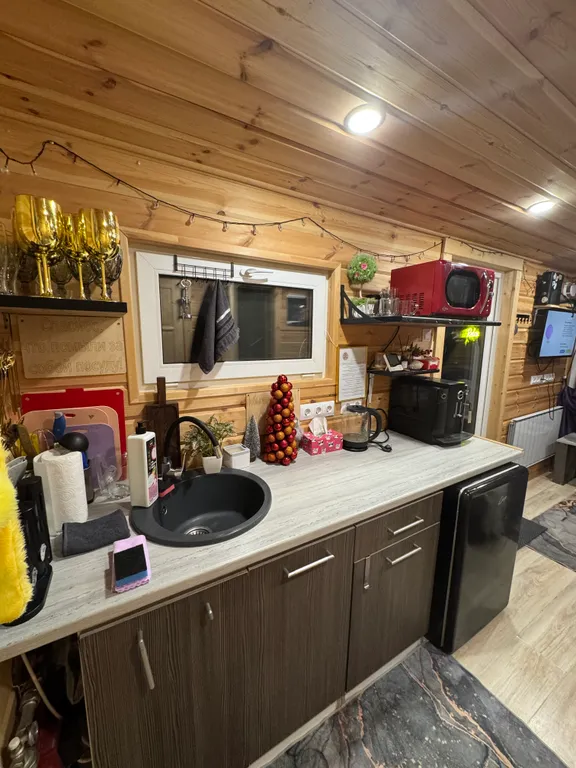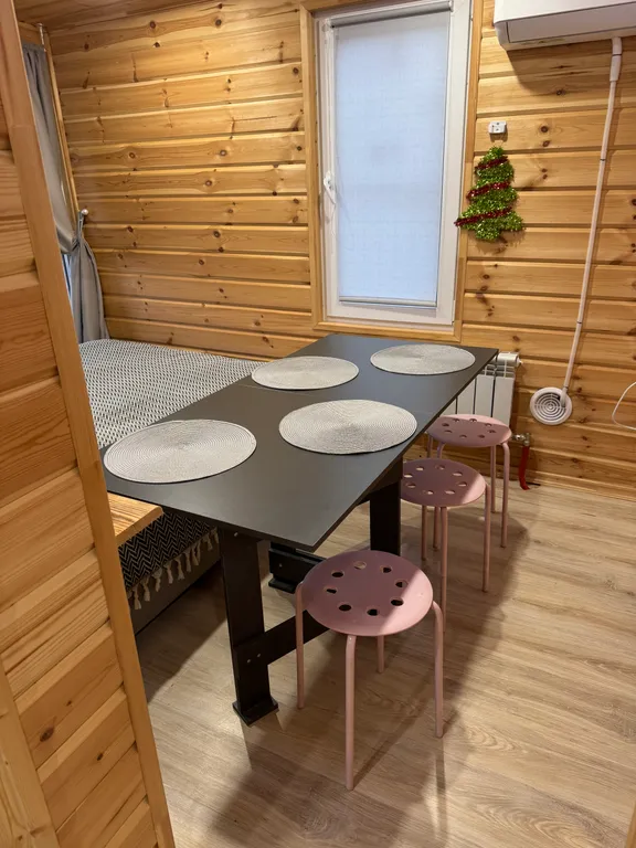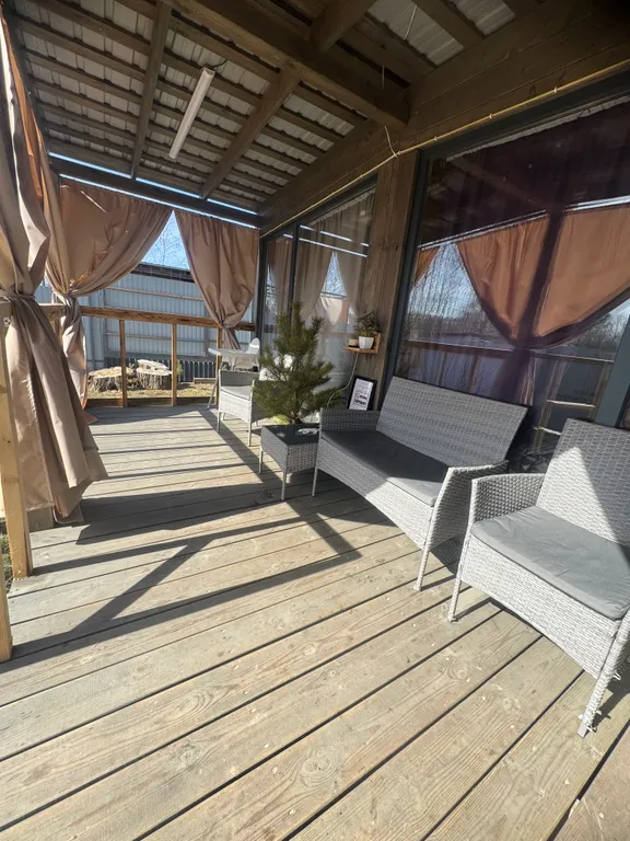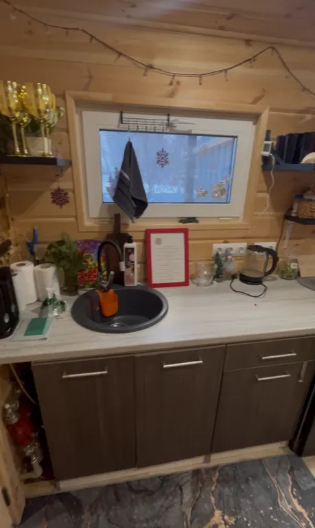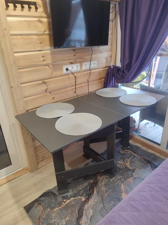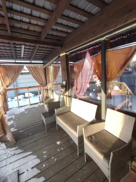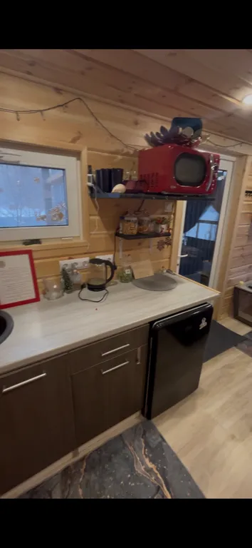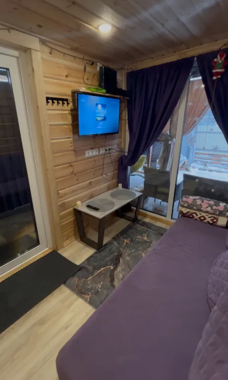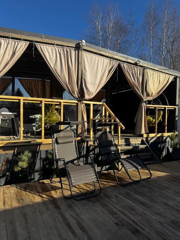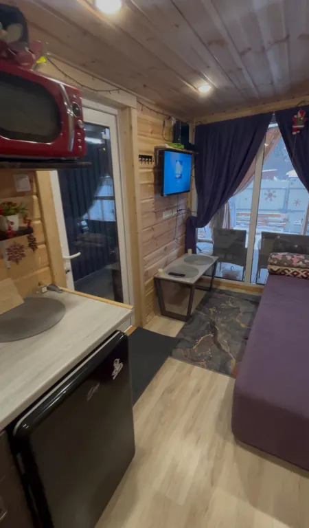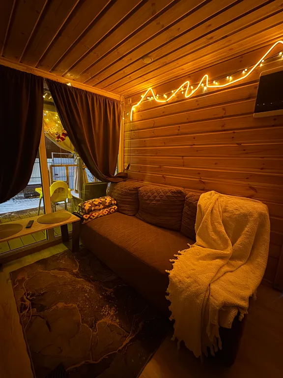 Терраса, теплые полы, душ, кухня (эл. Плитка, микроволновка, посуда), фен, колонка с алисой, tv с кинопоиском.