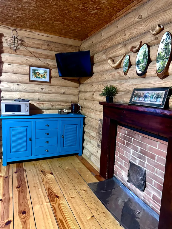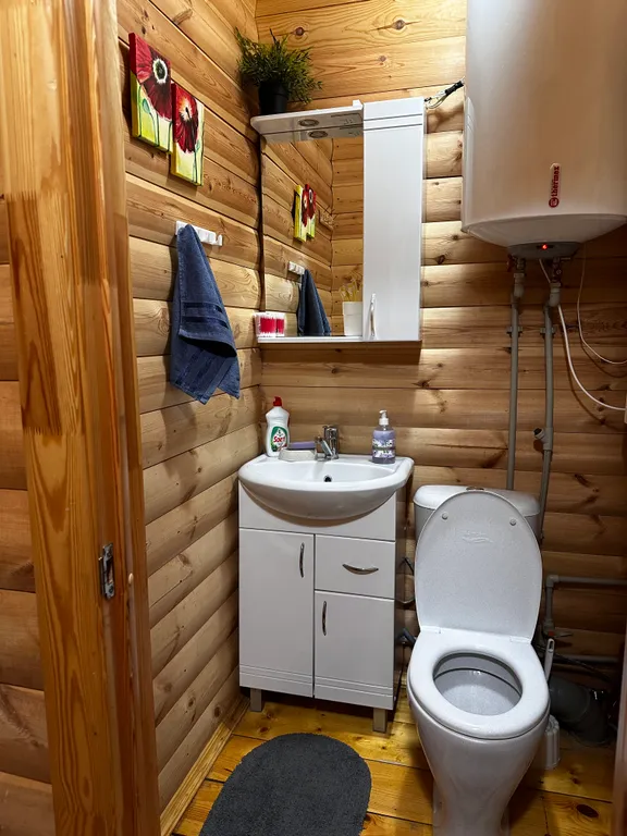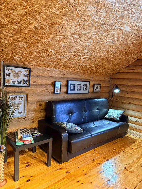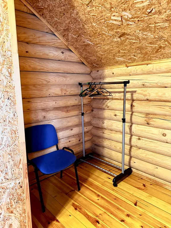 1 этаж — прихожая, санузел, душевая, гостиная (телевизор, холодильник, столовая посуда, электрический чайник, микроволновая печь, индукционная плита для приготовления пищи, стиральная машина, утюг, стол и стулья, угловой кожаный диван (2 спальных места, 140*200).