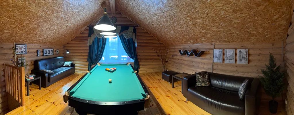 2 этаж — состоит из спальни (телевизор, кровать 2 спальных места, 140*200) и бильярдного зала (диван 120*185, 2 спальных места)