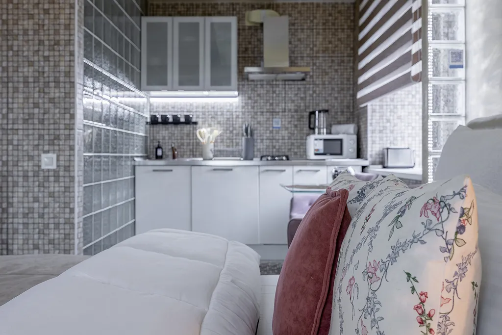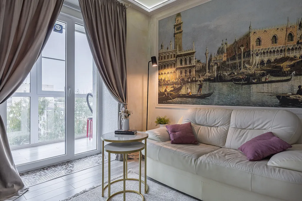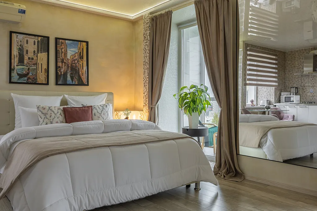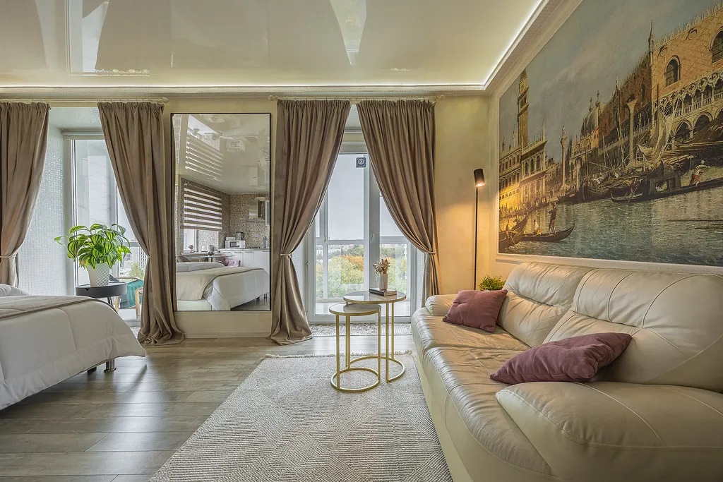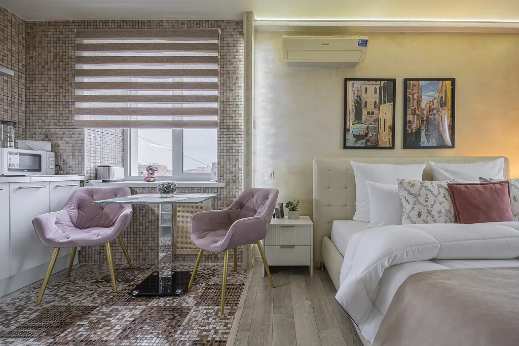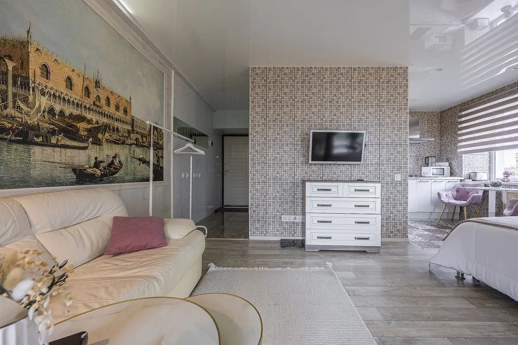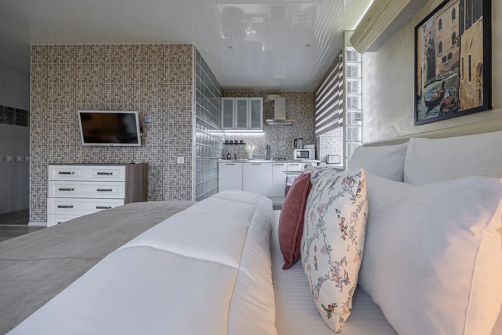 Уютная квартира-студия площадью 30 м² на 7 этаже античного дома. Идеально подходит для пары или друзей, семьи из 4 человек, командированных или туристов, приехавших небольшой компанией и желающих насладиться комфортом.