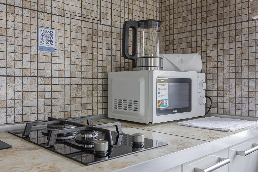 — полностью оборудованная кухня (холодильник, плита, свч-печь, чайник, набор посуды)