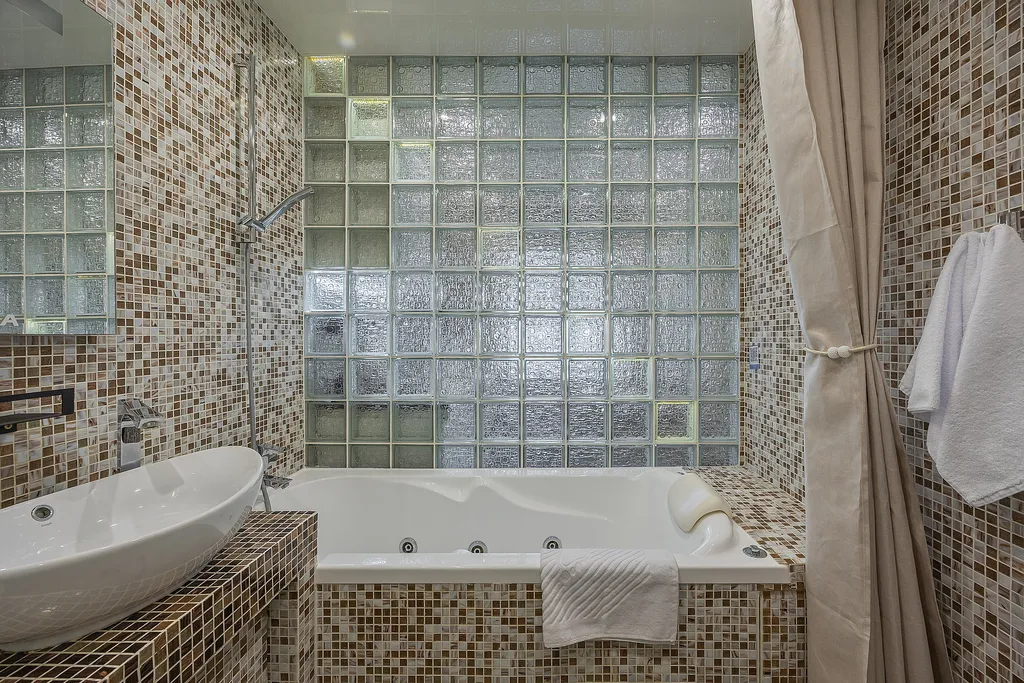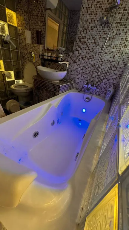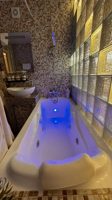 — ванная комната с джакузи, мягкими полотенцами и феном