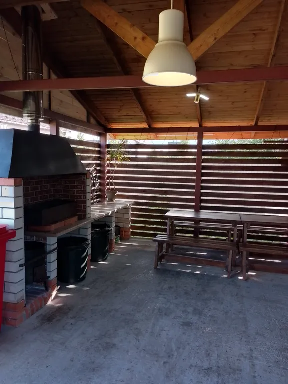 Крытая терраса, это очень удобно (не страшен дождь, снег, шашлык будет в любую погоду) с мангальной зоной, большим столом.