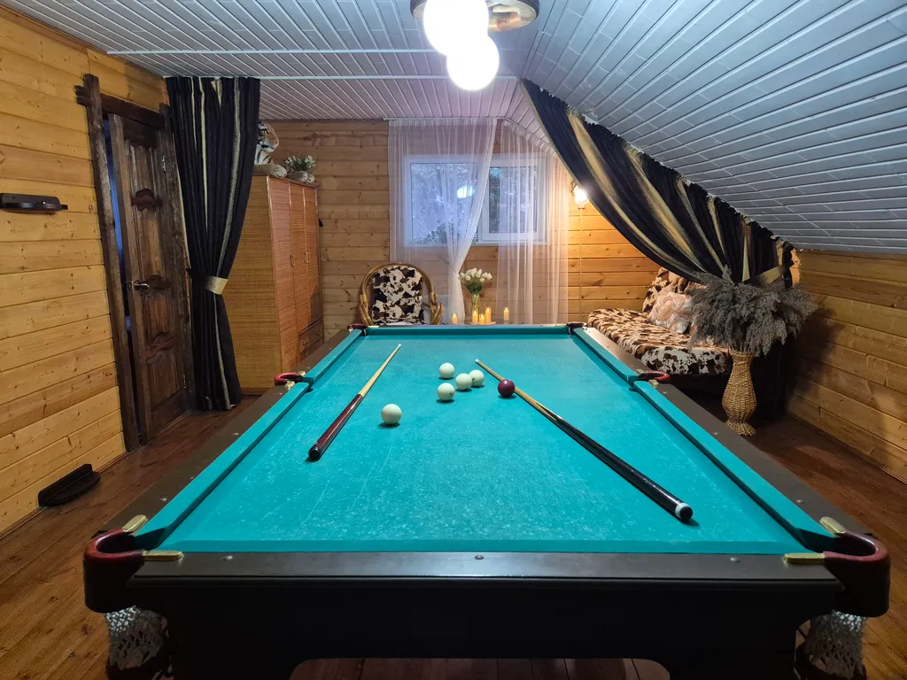 Двуспальный диван, кресло-качалка и столик (при желании от бильярдной зоны отгораживаются плотными портьерами, создавая приватную территорию для отдыха), шифоньер;