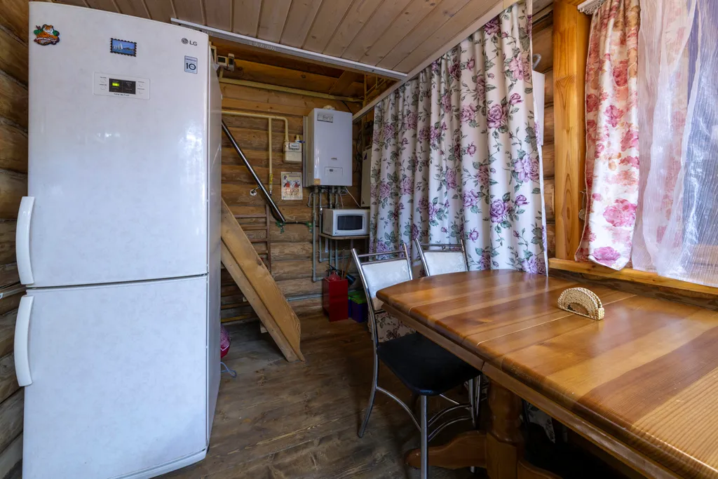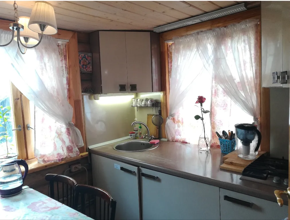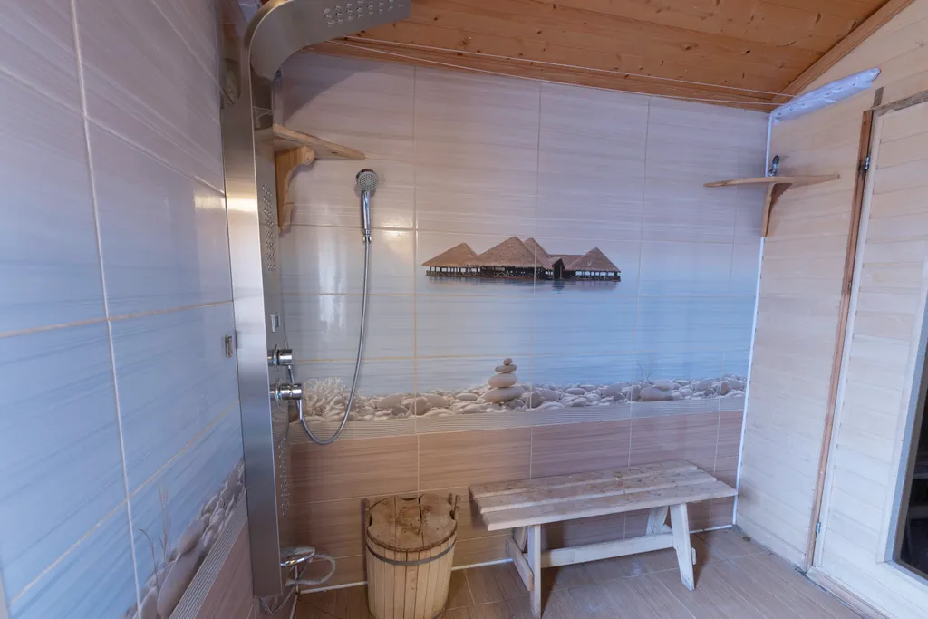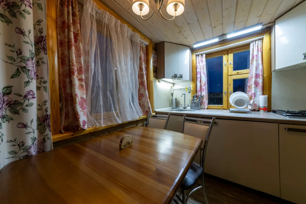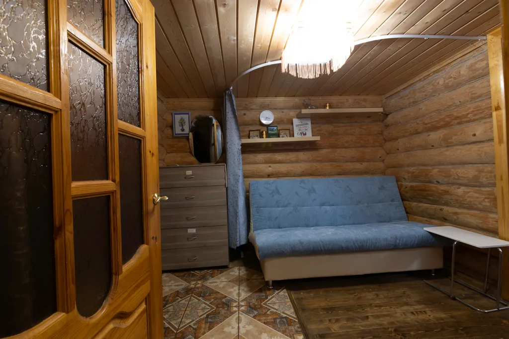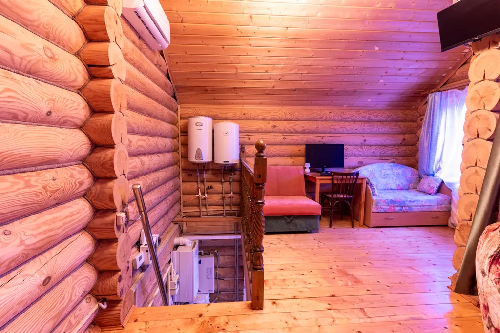 Дом двухэтажный, на 1 этаже проходная комната отдыха с диваном и кухня-столовая, на втором этаже спальня с 2-мя раскладным диванами и креслом-кроватью. Парная и ванная комната находится внутри дома. Печь имеет функцию "лёгкого пара" для любителей русской бани. Газовое отопление.