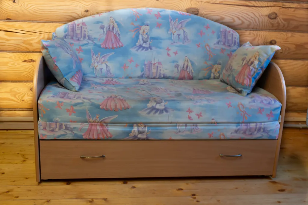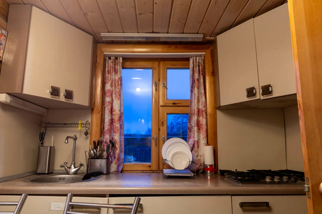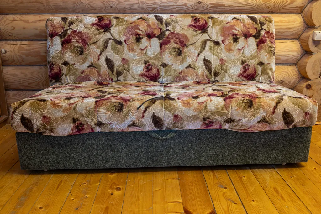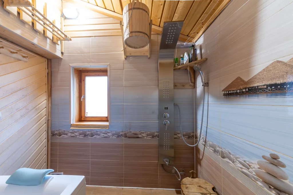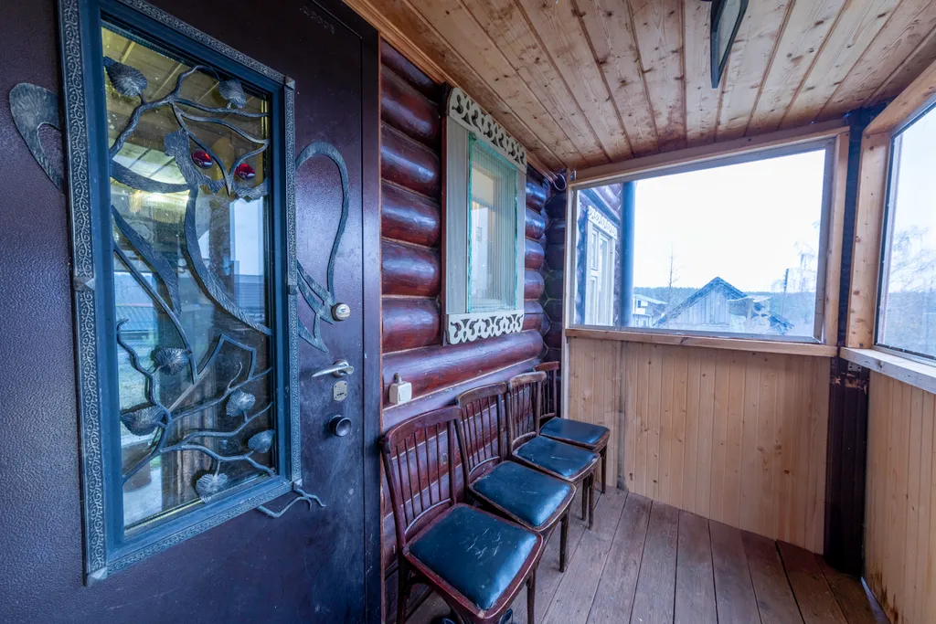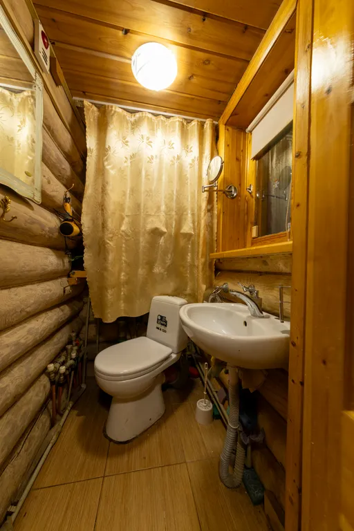 Дом двухэтажный, на 1 этаже проходная комната отдыха с диваном и кухня-столовая, на втором этаже спальня с 2-мя раскладным диванами и креслом-кроватью. Парная и ванная комната находится внутри дома. Печь имеет функцию "лёгкого пара" для любителей русской бани. Газовое отопление.