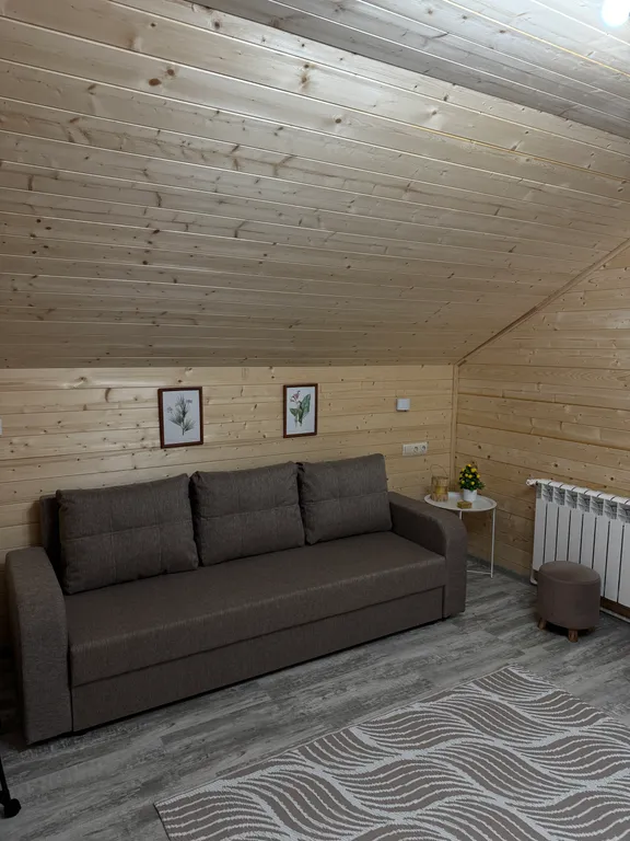 - Вместимость: до 6 гостей (1 кровать + 2 двухспальных дивана).