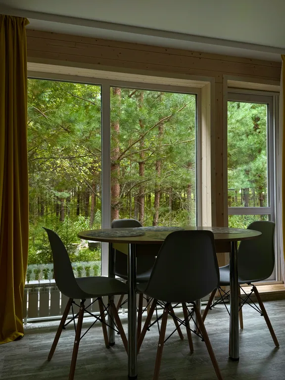 - Просторная кухня-гостиная с панорамными окнами и потрясающими видами на лес.
