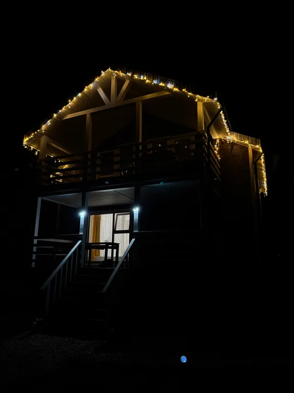 - Вечером дом и территория подсвечиваются гирляндами, создавая волшебную атмосферу.