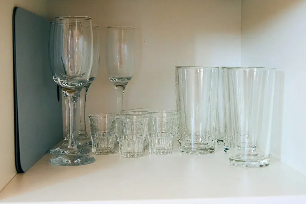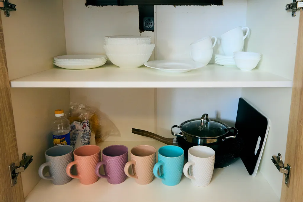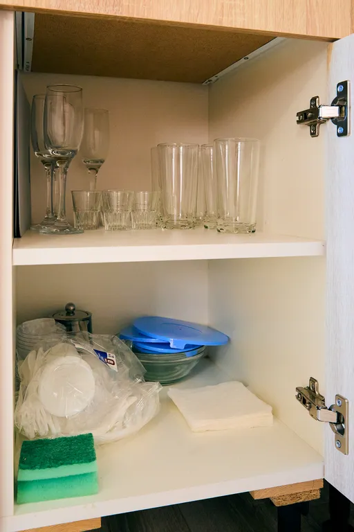 В кухонных шкафах находится вся необходимая посуда для приготовления пищи.