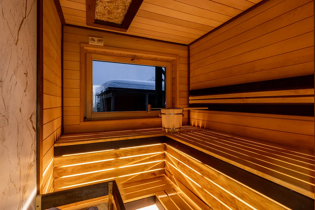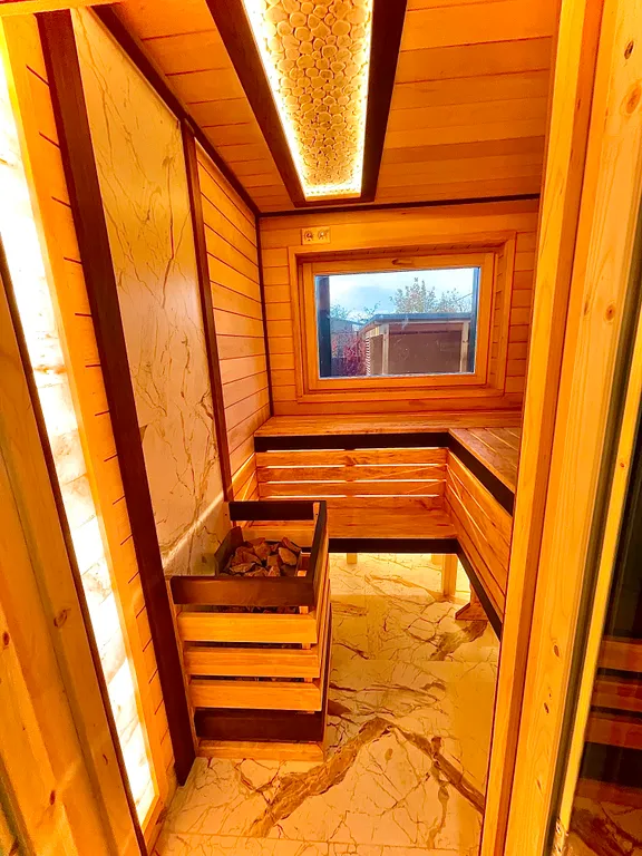 3 комнаты- две спальни с кроватями 160х200, кухня гостиная с раскладным диваном, прихожая, два сан узла, большая терраса, баня - сауна находится тоже в доме..