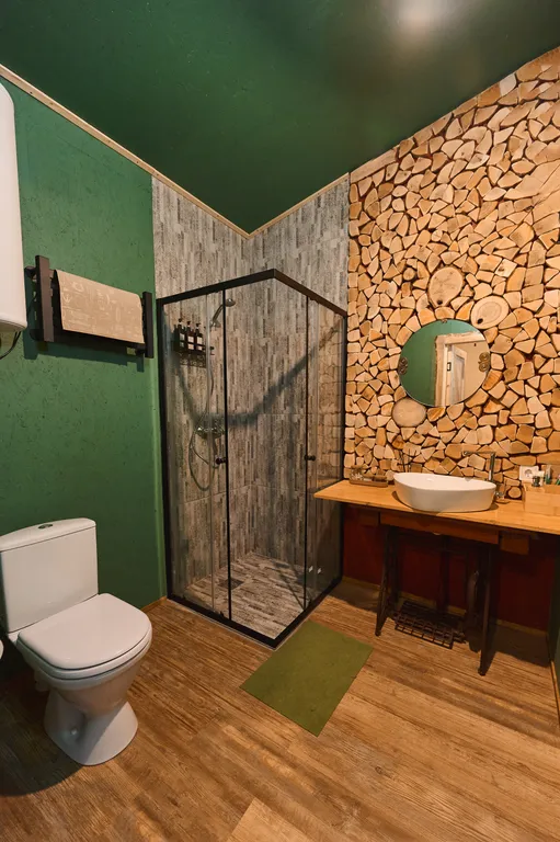 -Оборудованный санузел с душевой, средства гигиены, фен, тапочки, полотенца, зубной набор.