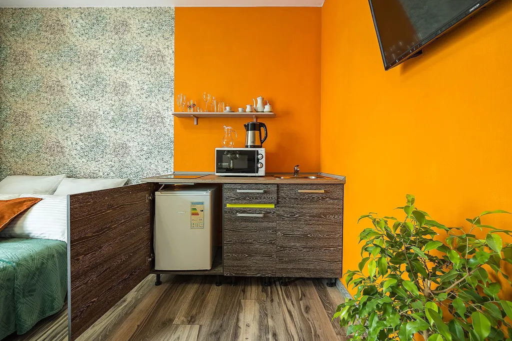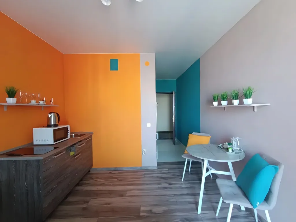 Квартира обставлена необходимой мебелью и техникой. Полноценно укомплектованная кухонная зона электрическая плита, чайник, микроволновая печь, холодильник, посуда и столовые приборы.