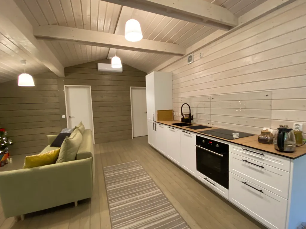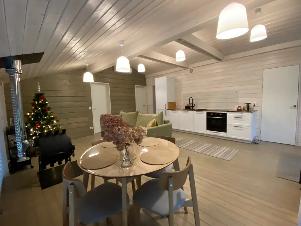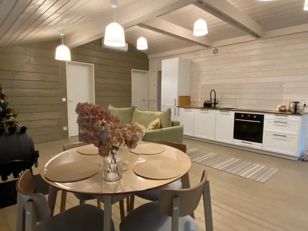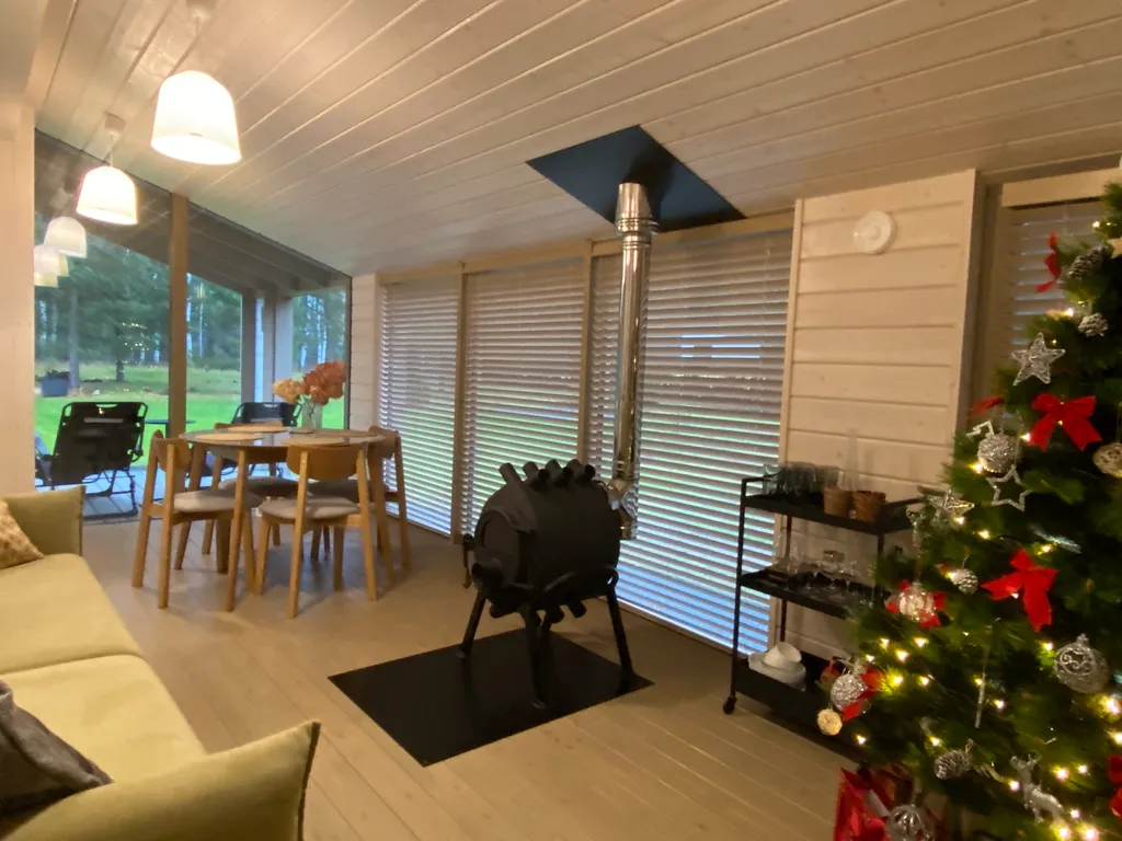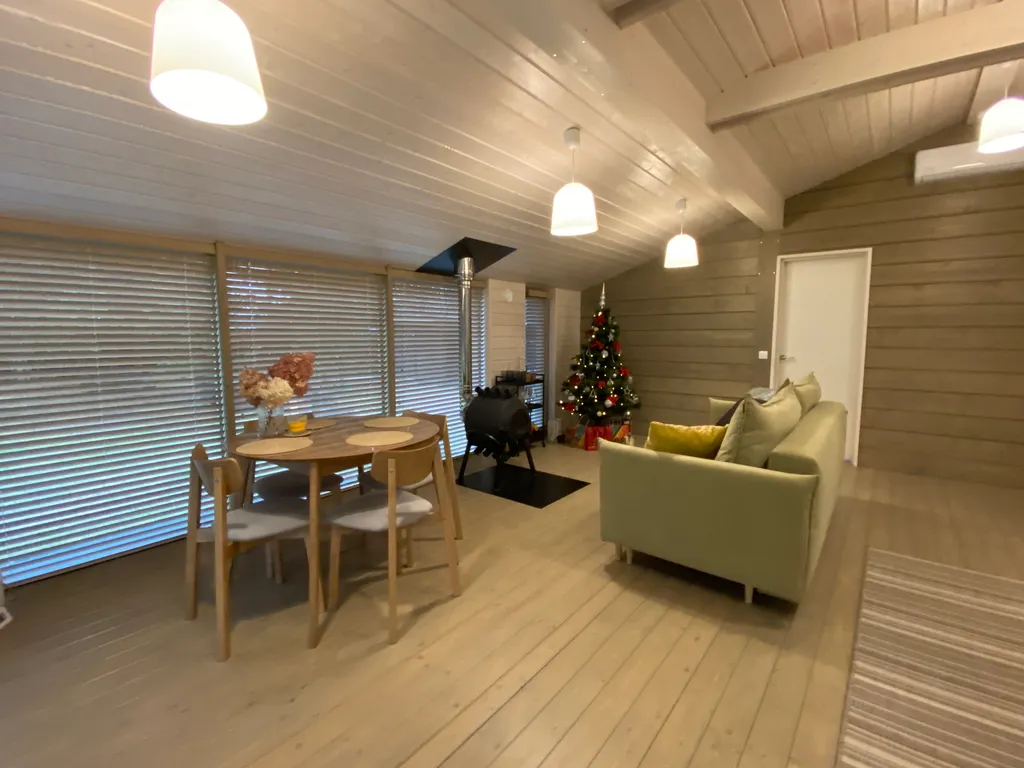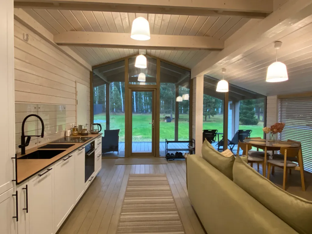 - Кухня-гостиная: объединённое пространство с дровяным камином и панорамным видом на лес!