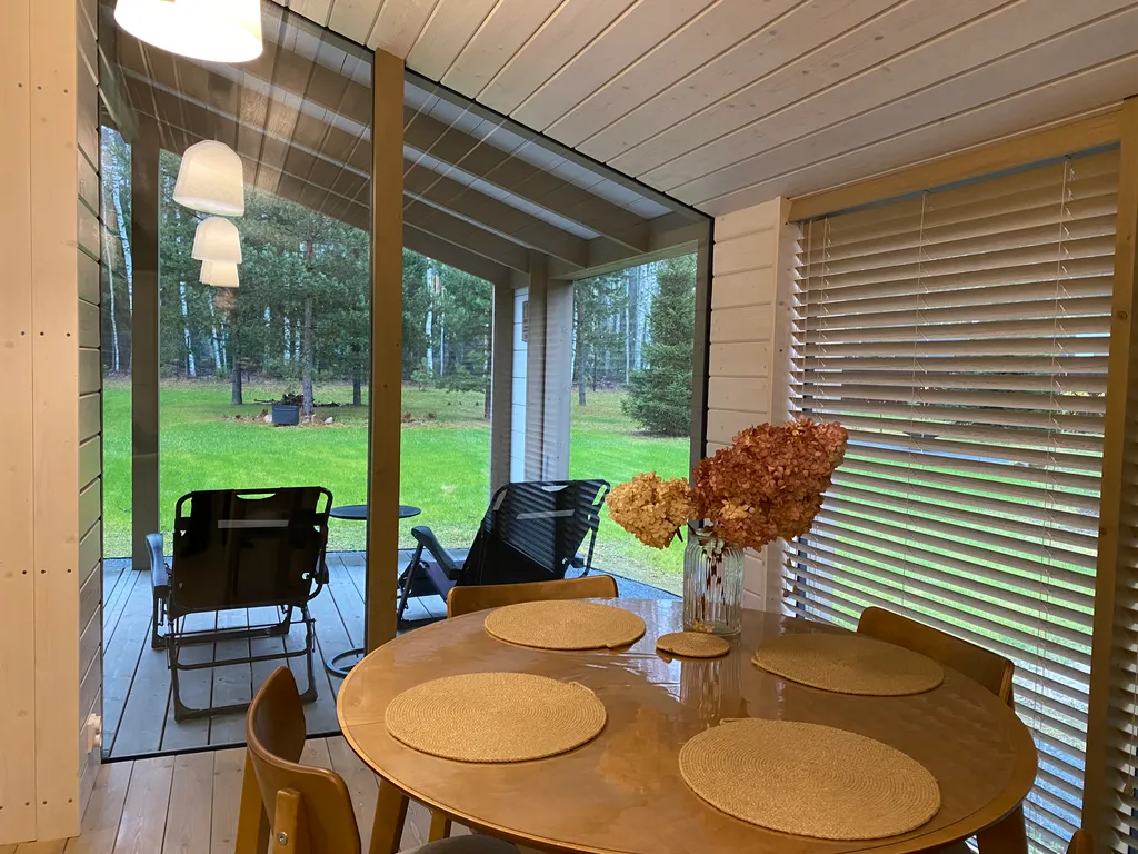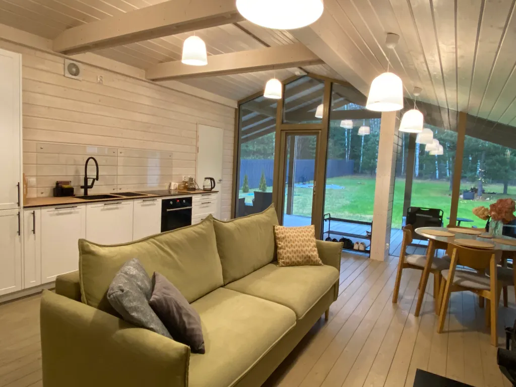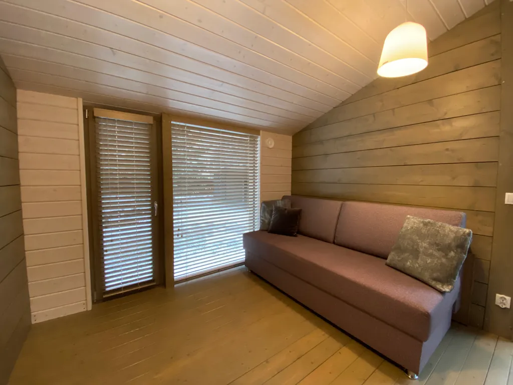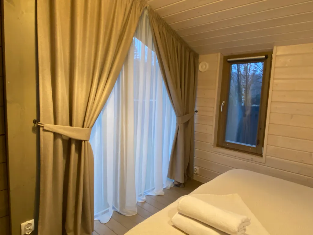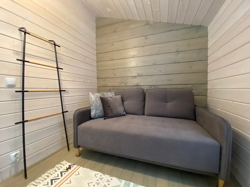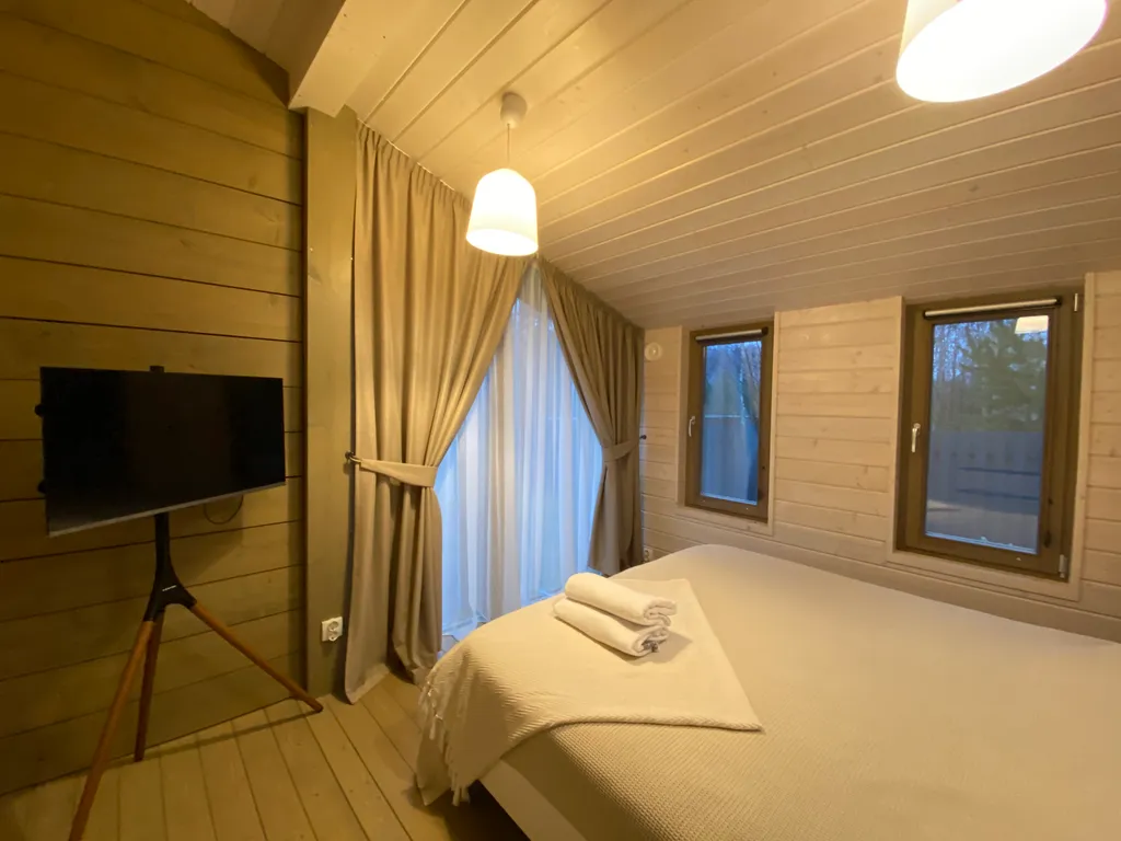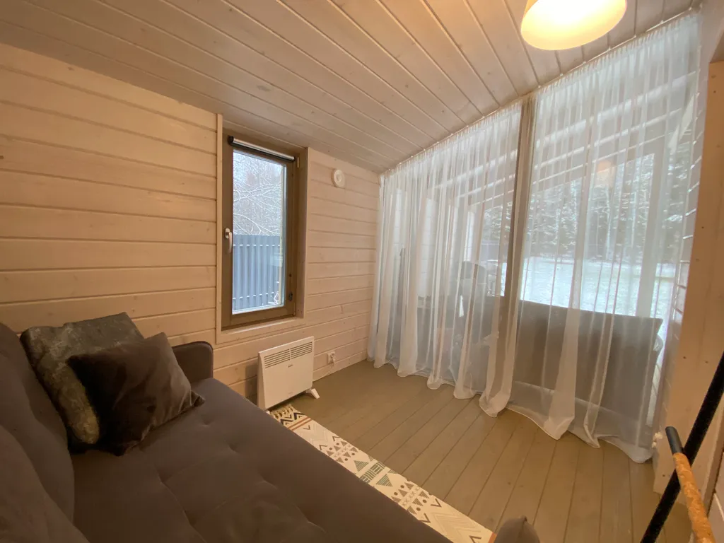 - Вторая спальня: двуспальный диван-кровать 160 см с панорамным окном с видом на лес.