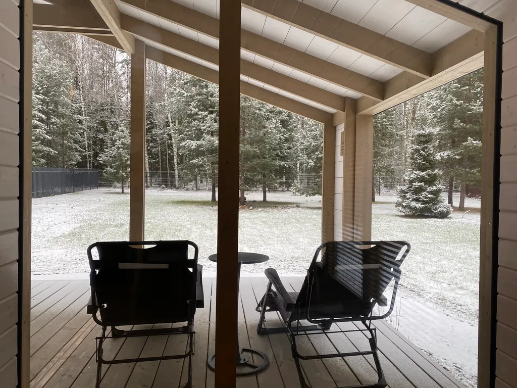 - Большая крытая терраса с садовой мебелью, шезлонгами и шикарным видом на лес!