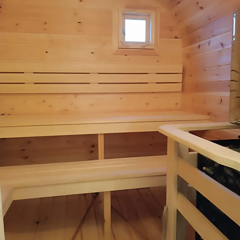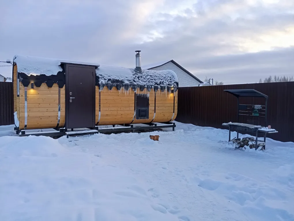 Баня-бочка с комнатой для отдыха, помывочной и печкой в парной с двумя каменками: закрытой и открытой.