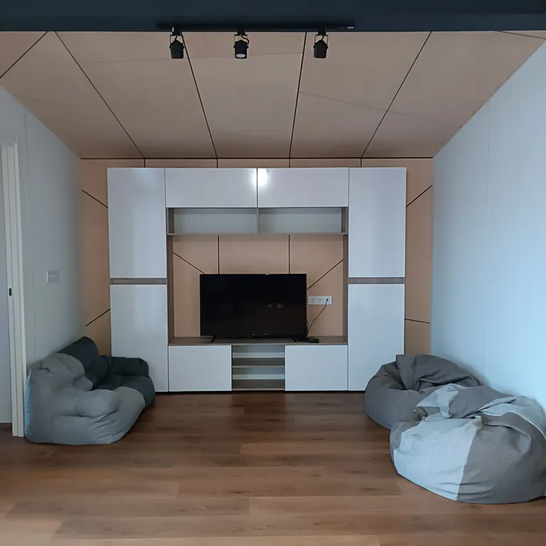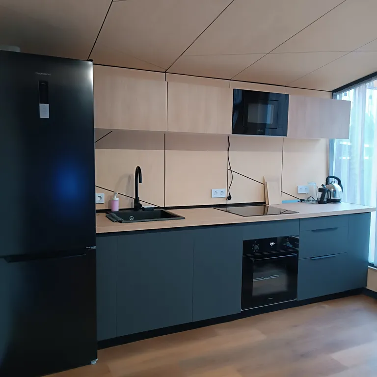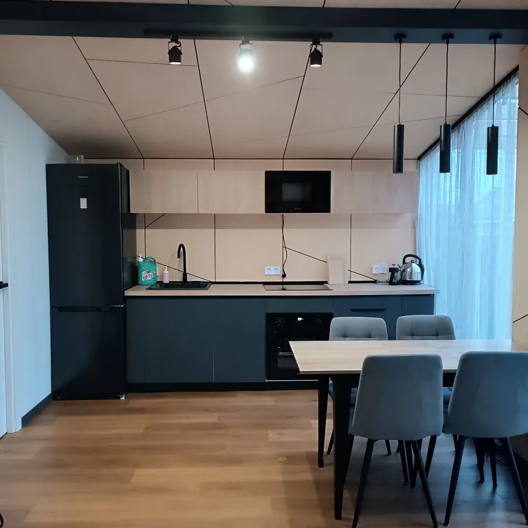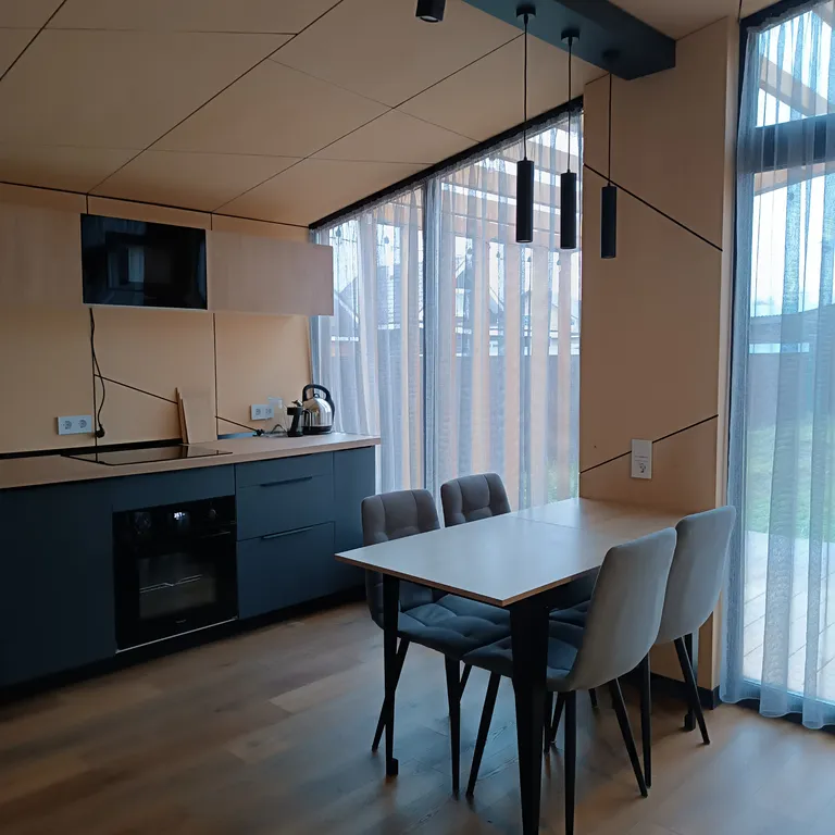 кухня-гостиная со всем необходимым: плита, духовой шкаф, посудомоечная машина, микроволновая печь, чайник, холодильник, весь комплект посуды, обеденный стол, стулья, телевизор, Wi-Fi, кондиционер, настольные игры, тёплый пол;