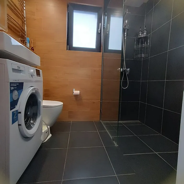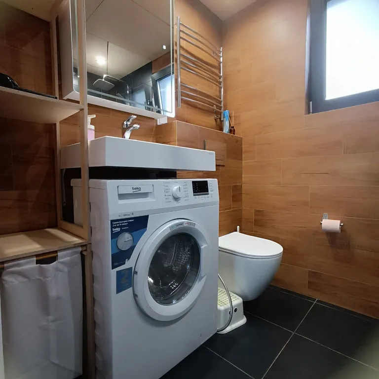 ванная комната — душ, стиральная машина, унитаз, водонагреватель, полотенцесушитель, фен, полотенца, набор гигиенических средств (мыло, туалетная бумага, гель для душа, ватные палочки и диски), тёплый пол;