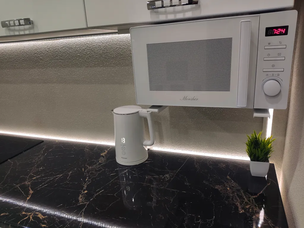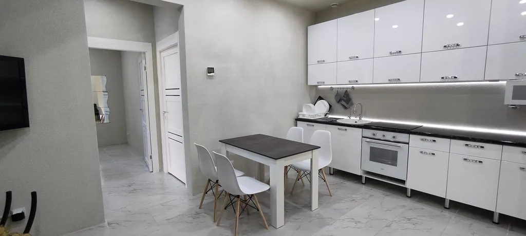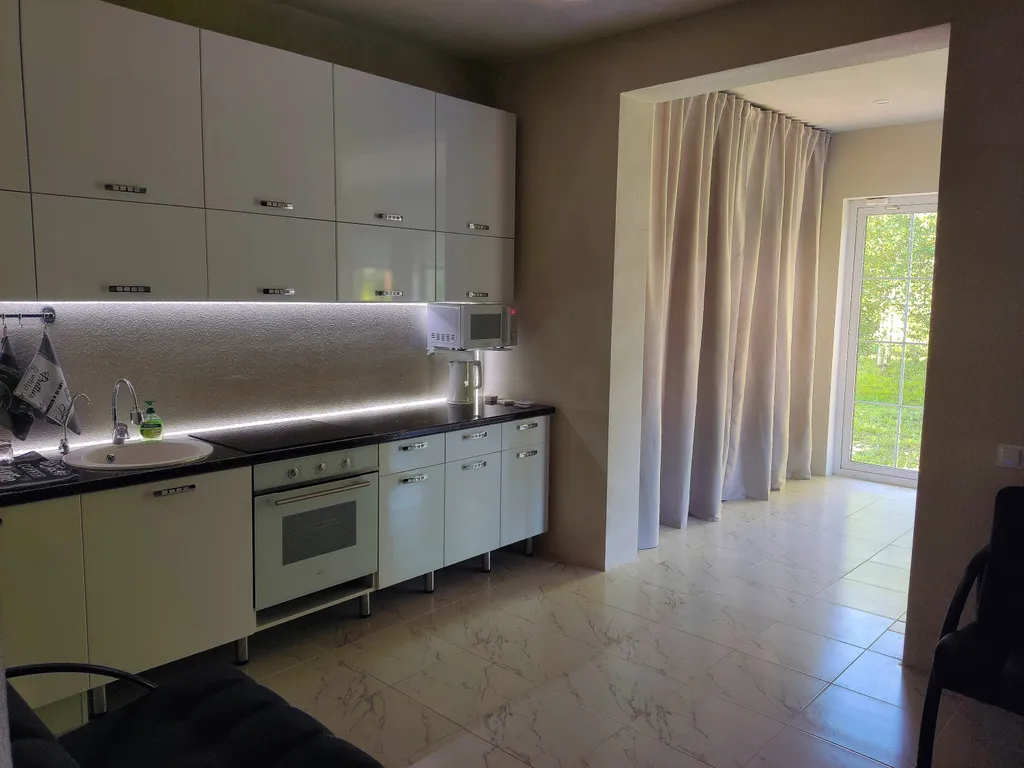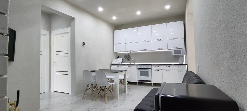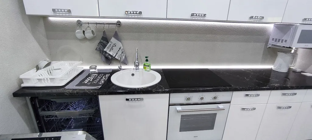 - Оборудованная кухонная зона: холодильник (объём 95 литров), духовой шкаф, микроволновая печь, чайник, варочная поверхность, салатницы, кастрюли, сковорода, вилки, ложки, кружки, стаканы, стопки, бокалы, штопор и т. д.