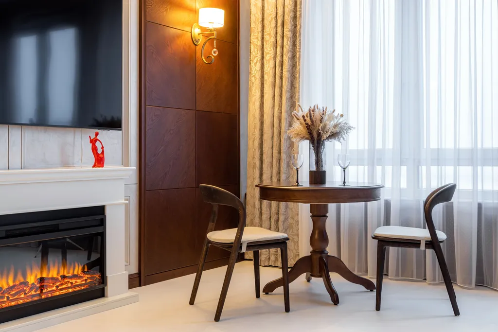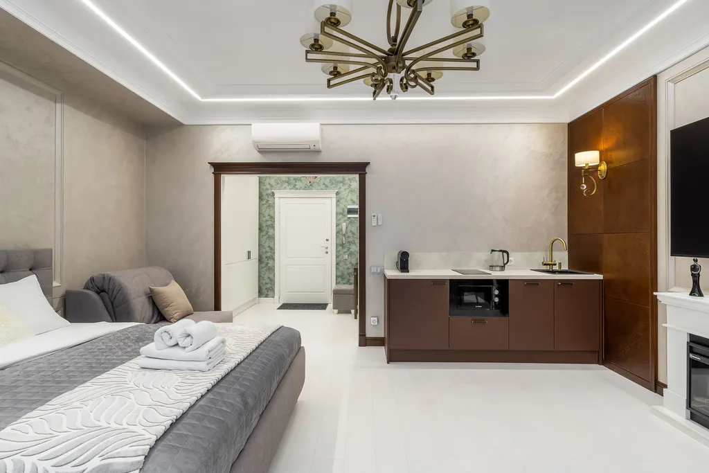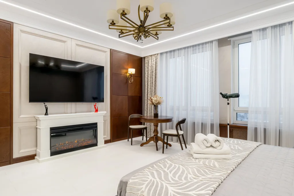 Каждая деталь продумана для вашего комфорта: двуспальная кровать 180*200, постельное белье, два кресла-кровати 90*200, полноценная кухня, обеденная зона, телевизор, Wi-Fi, кондиционер, кофемашина, камин, утюг/гладильная доска.