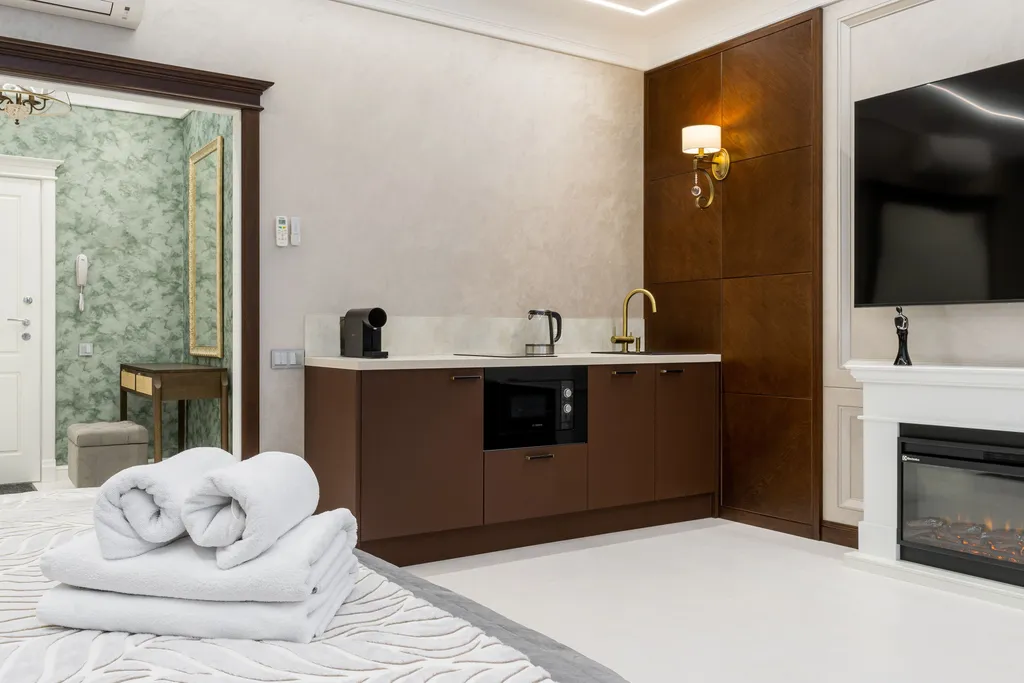 К Вашим услугам: чайный сет, сладкий комплимент, питьевая вода, средство для мытья посуды.