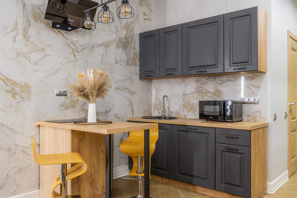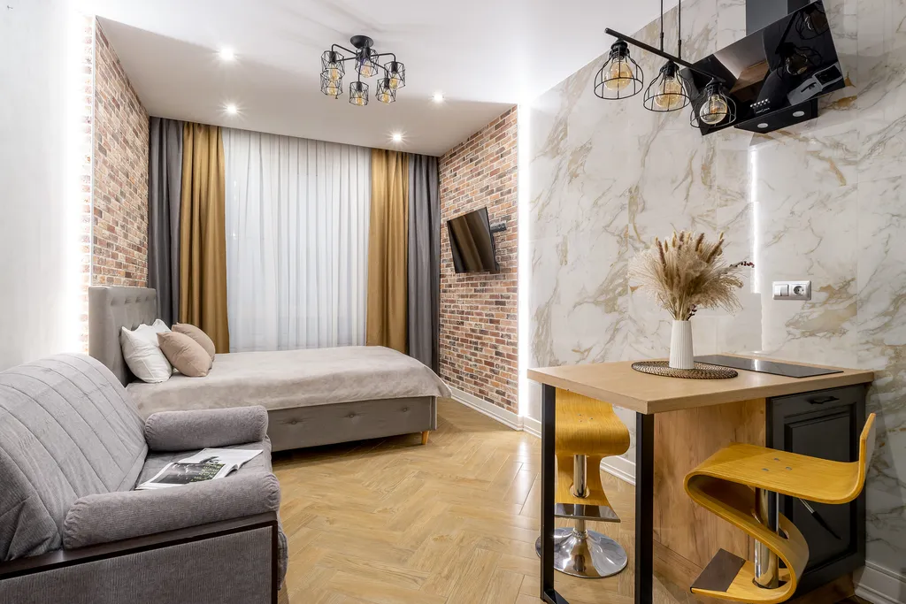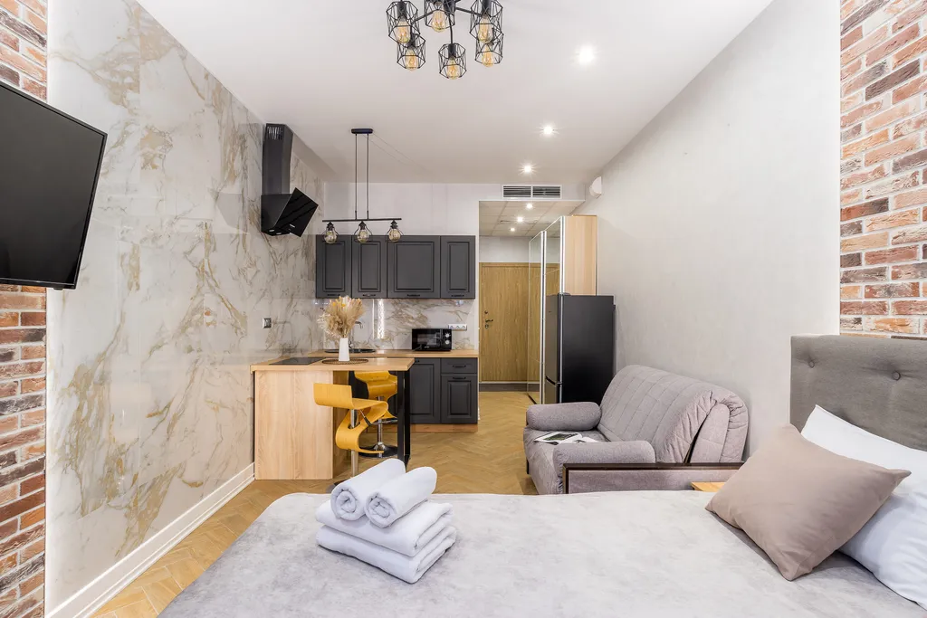 Студия меблирована и оборудована всем необходимым для комфортного проживания: двуспальная кровать 140*200, постельное белье, диван 120*200, телевизор, WI-FI, утюг, полноценная кухня и обеденная зона.