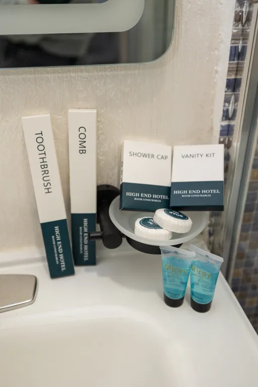 Полный набор гигиенических принадлежностей: гель для душа, шампунь, бальзам, мыло, бритвенный набор, шапочка для душа, лосьон для тела, расчёска, зубной набор (предоставляются по требованию);