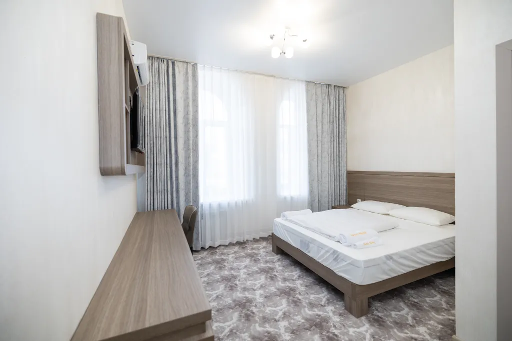 Эргономичная мебель: двуспальная кровать с ортопедическим матрасом, прикроватные тумбы, письменный стол, шкаф со встроенным сейфом, раскладной диван;