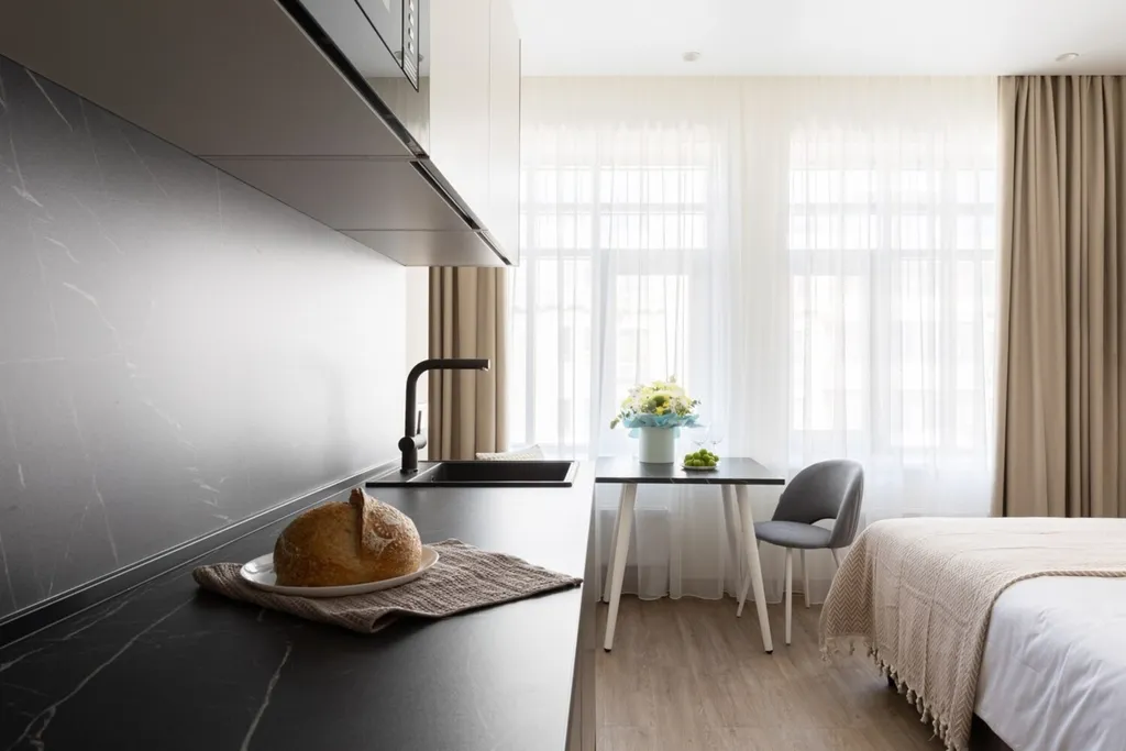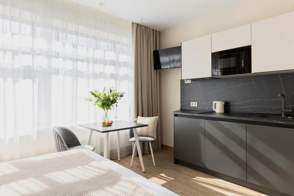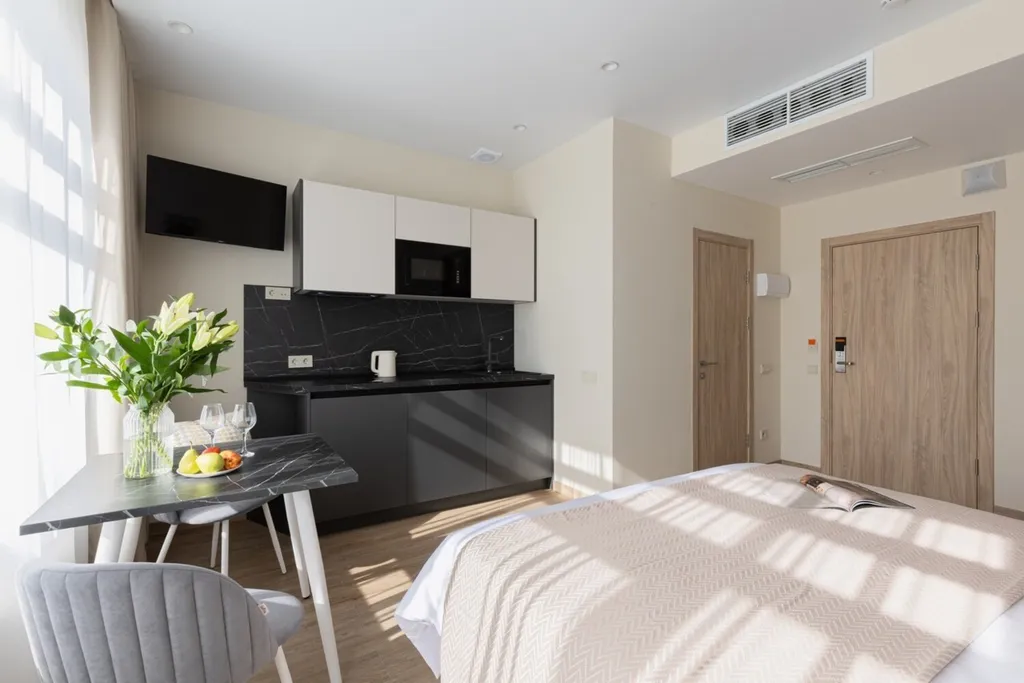Этот уютный номер с большой кроватью и функциональной мини-кухней - всё необходимое для отдыха и восстановления сил после насыщенного дня.