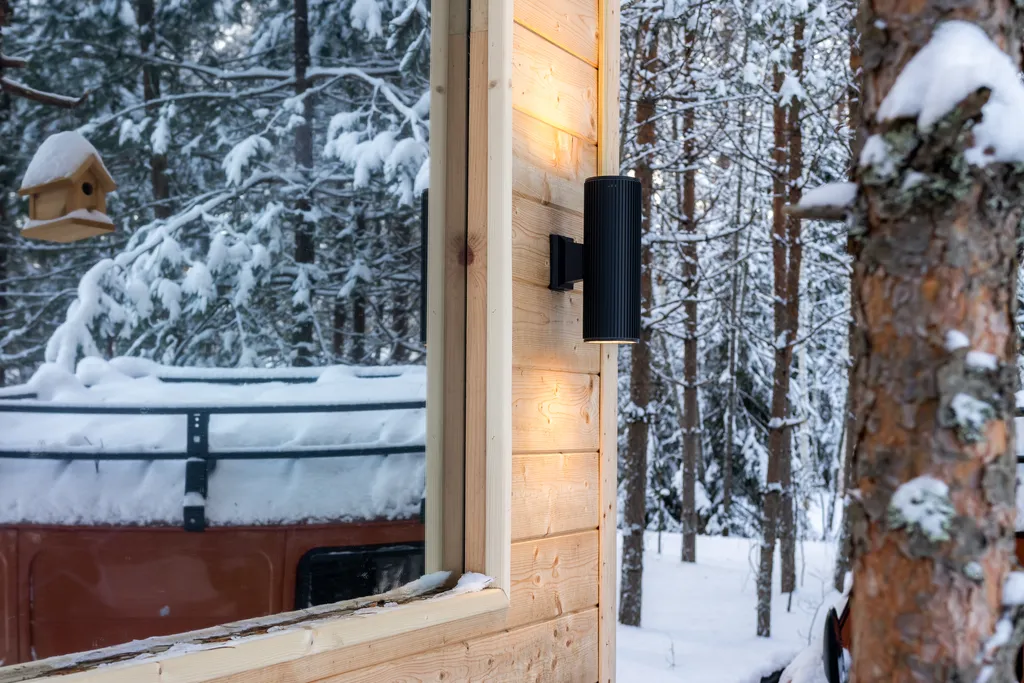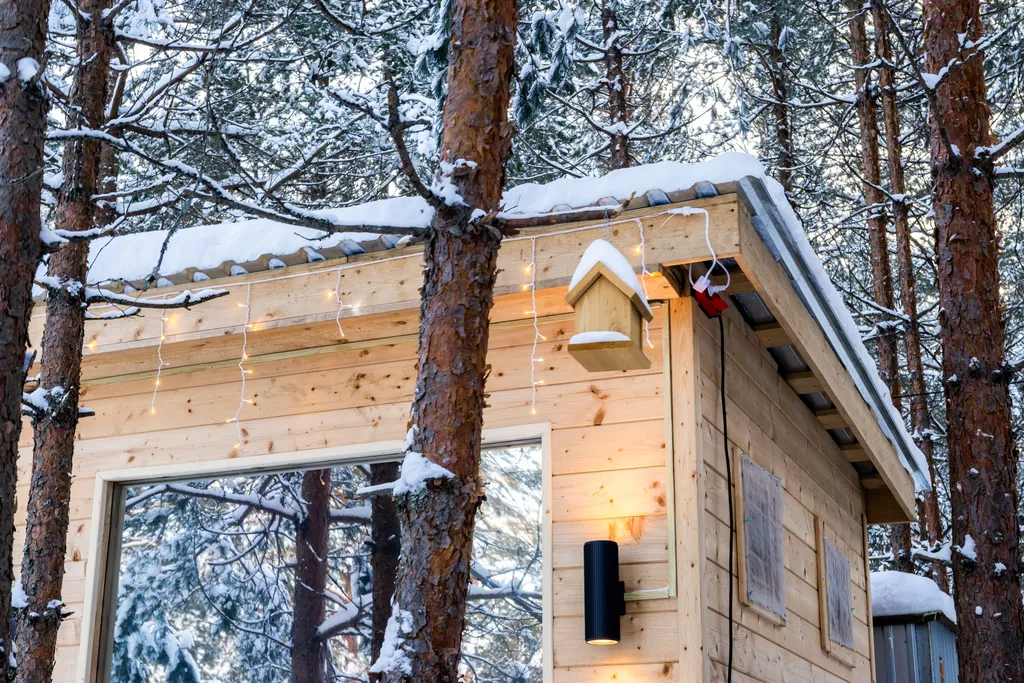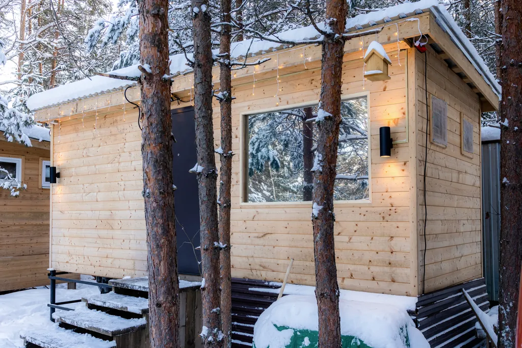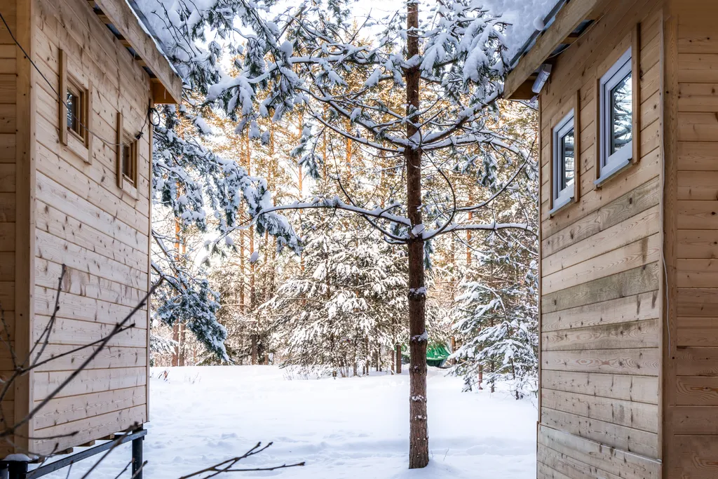 Домик расположен на территории Экопарка «Дар» в Нижегородской области — на полуострове, окружённом рекой Керженец.