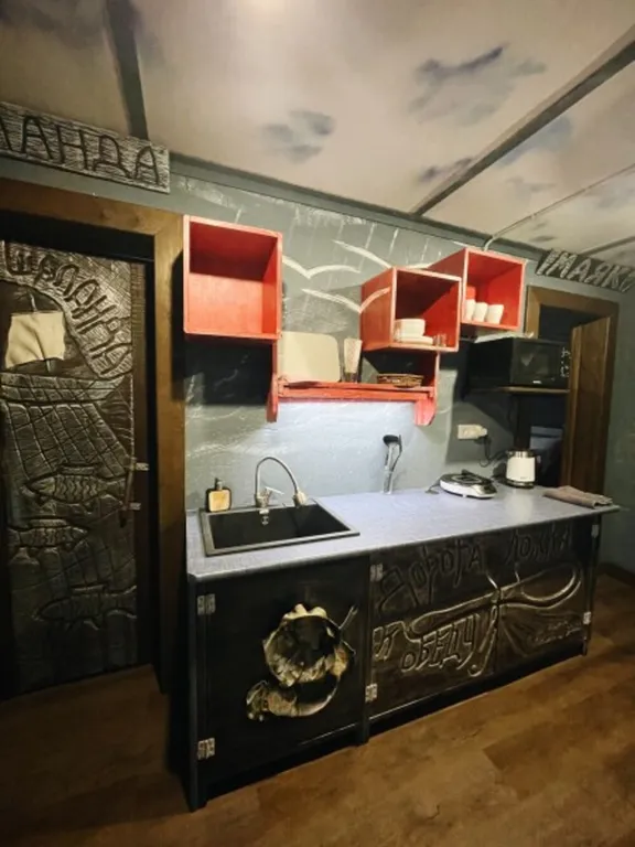 Мини-кухня (плита, свч-печь, чайник, посуда), телевизор
