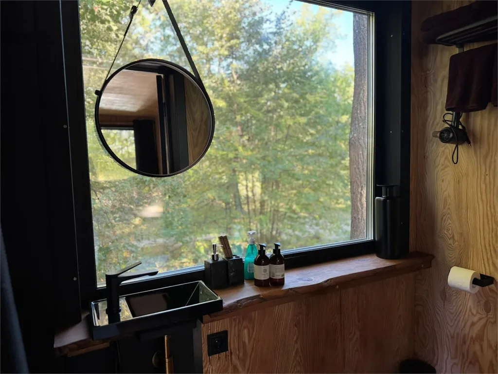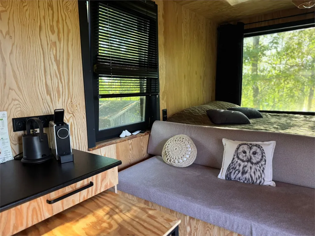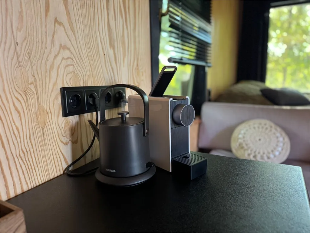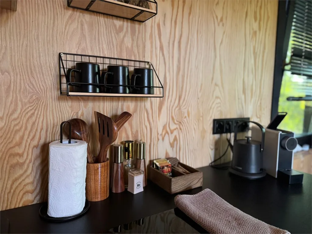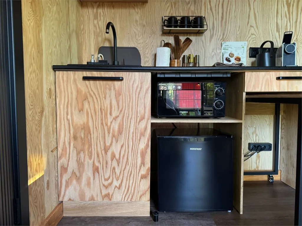 В доме полностью оборудованная кухонная зона (капсульная кофемашина (капсулы предоставляются), электрический чайник, индукционная плита, холодильник, выдвижной стол, раковина с питьевой водой, посуда для приготовления еды, столовые приборы).